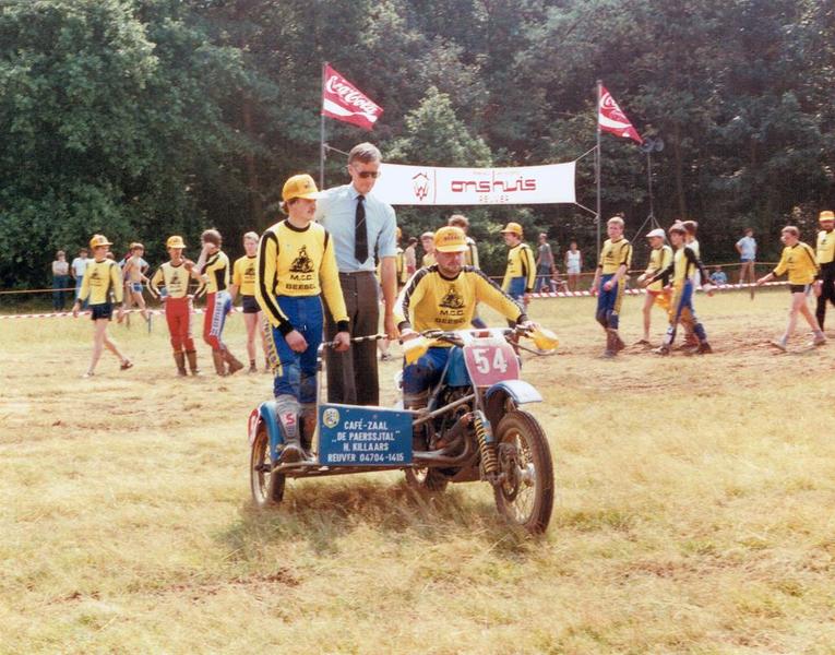 Verenigingen en organisaties | Han Beurskens en Peter Schoeben bieden burgemeester Nuytens een lift aan bij de officiële opening van de internationale motorcrosswedstrijd georganiseerd door motorcrossclub M.C.C. Beesel in de Walsberg. | Walsbergweg | Reuver | 1985 | ||||