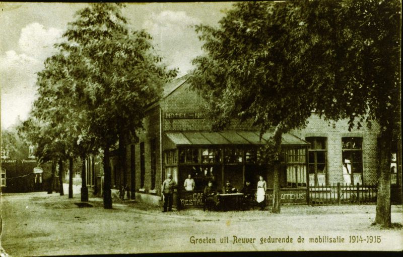 Café / Restaurant / Cafetaria | Het Stationskoffiehuis dat Lambert van der Velden kocht van A. Hulsman in 1912. De veranda werd in 1911 aangebouwd. De weegbrug dateert van 1912. Links staat F. Sanders, de pachter. Het café-restaurant werd gebouwd door Sigbert Stoffels, die oorspronkelijk in het centrum van Reuver woonde en daar langs de Gerardusstraat een brouwerij had. Aan het eind van de zeventiger jaren van de 19e eeuw verkocht hij het aan A. Niemans. A. Hulsman trouwde een dochter van Niemans en kwam zo in het bezit van h Meer ... | station | Reuver | 1915 | ||||