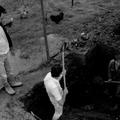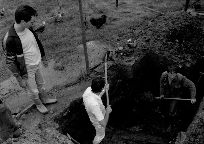 Opgravingen bij hof T'genraede in Bussereind te Reuver. Van links naar rechts Twan ERnst, Wiel Luys en Ab van Dijk. |