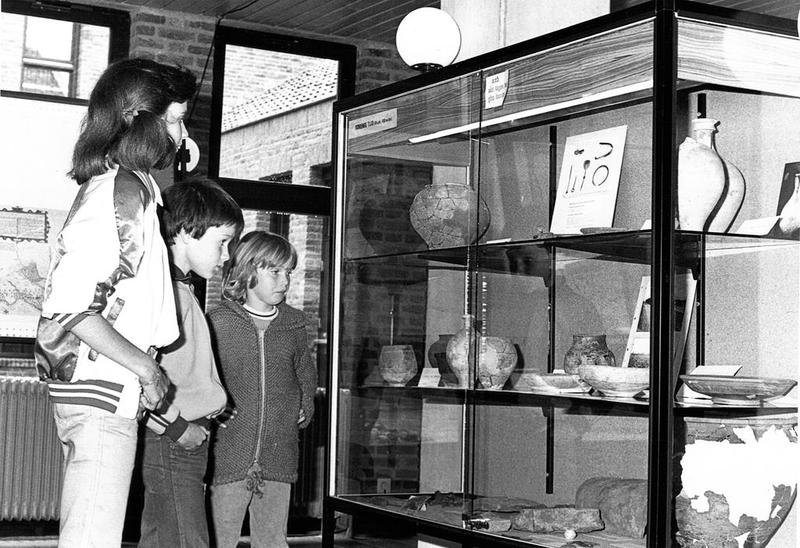Opening van de door Archeologische werkgroep Beesel georganiseerde tentoonstelling "Bieslo aen die Maese " in de hal van het gemeentehuis. De jeugd toonde, zoals op de foto te zien is, ook belangstelling voor het tentoongestelde. |