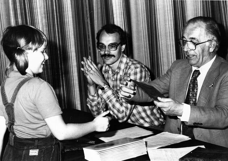 Opening van de door Archeologische werkgroep Beesel georganiseerde tentoonstelling "Bieslo aen die Maese " in de hal van het gemeentehuis. Burgemeester Hendrix en voorzitter W. Luys overhandigen een jeugdige bezoeker een aandenken |