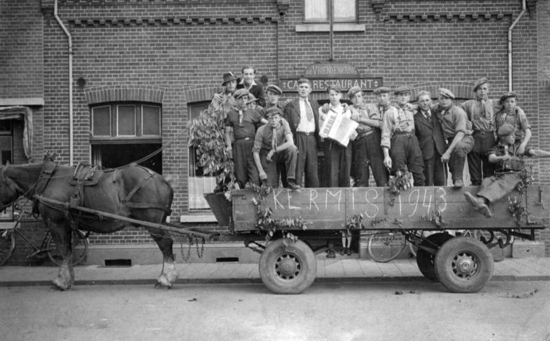 Reuverse Kermis in 1943 voor café Janssen aan de kerk. Op de foto onder anderen: Lex Nelissen, Jeu Muisers, Cor Janssen (onderduiker en gefusilleerd), Pierre Vullers, Wim Gommans, Pierre de Rijk, Sjaak Rutten (van de Wilde Hoeve), Frits Franssen (Braus), Sjra de Rijk, Piet Rovers en zittend Harrie Beurskens. |