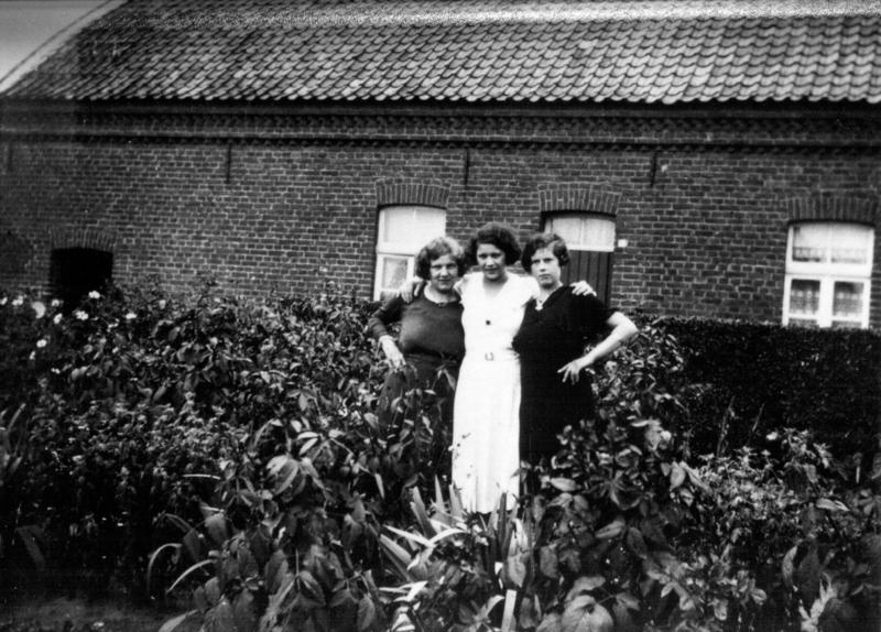 Dit is het huis van Wassen langs de Keulseweg in Reuver. Op de foto staan Tienke, Marie en Triena Wassen. In een feestroes lieten dronken Duitse soldaten, die de laatste maanden van de Tweede Wereldoorlog in Reuver verbleven, deze woning van oud op nieuw (1944-1945) in de lucht vliegen. Destijds woonde de familiei Geel Hendriks in deze woning. |