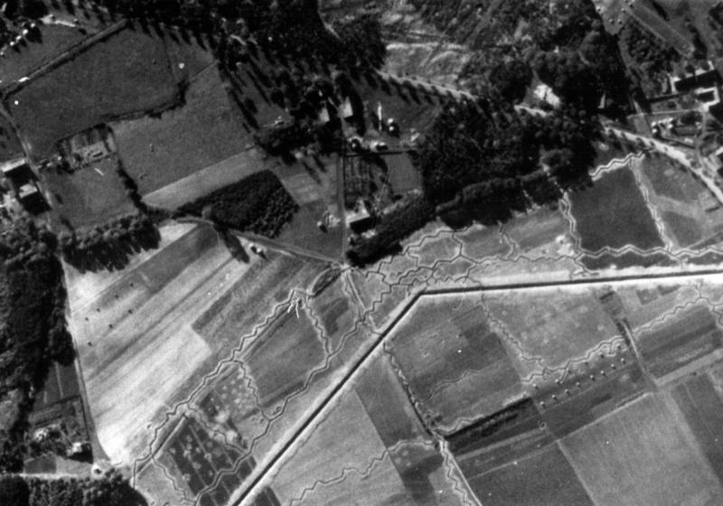 Oorlog | Een luchtfoto gemaakt door een geallieerd verkenningsvliegtuig in het najaar van 1944. Het is het gebied tussen de Maas, hoeve "De Kamp (rechts) en de St. Lambertuskapel (links). Duidelijk is de verdedigingslinie te zien met de zogenaamde tankgracht en de loopgraven. | Oude veerweg | Reuver | 1944 | ||||