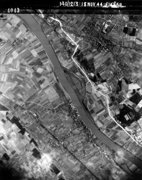 Oorlog | De luchtfoto werd gemaakt door een RAF vliegtuig in de Tweede Wereldoorlog. Rechtsboven is Reuver te zien. Langs de Maas is duidelijk de tankgracht te zien, die parallel met de Maas loopt. | Oude Veerweg | Reuver | 18-11-1944 | 1944 | |||