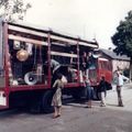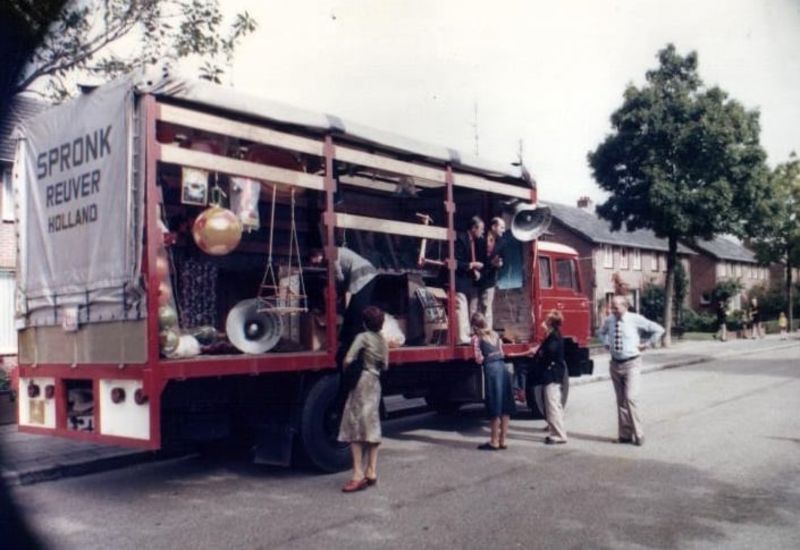 Vervoer overig | Met Reuverse kermis reed een vrachtwagen van Dick Spronk door Reuver waarin alle prijzen die gewonnen konden worden met de loterij van het mannenkoor stonden opgesteld. Rechts met stropdas Dick Spronk | Karel Doormanlaan | Reuver | 1970 | ||||