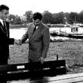 Picknickplaats "De Schans" wordt officieel in gebruik genomen. Burgemeester Nuytens bevestigt een naamschild op de bank als openingshandeling. |