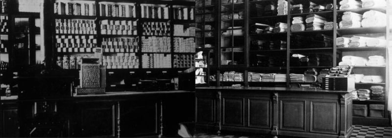 Het interieur van Coöperatie "ons Belang". Op de foto de rechts de textielafdeling en links het uitzicht op de kruidenierswaren van de winkel, er tussen in was een grote ruimte die naar de een deel van de winkel leidde waar je klompen kon kopen. Aanvankelijk werd gestart in een gebouw aan de Julianastraat. Later kapperszaak Schoeren. Het winkelgebouw is van iets latere datum. De bakkerij, kantoor en magazijn van 1919. |
