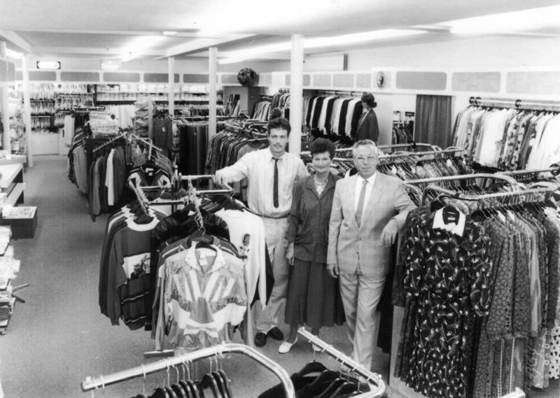 De familie Killaars - Vriesen in hun mode- en textielwinkel aan de Rijksweg in Reuver. V.l.n.r Richard Killaars - Mevr.Killaars- Vriesen en Jos Killaars. |