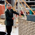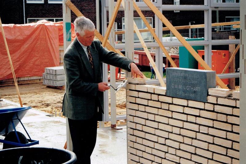 Wethouder Gerard Ligthart droeg letterlijk een steentje bij. De eerste steen legging van het multifunctioneel centrum "de Meander". |