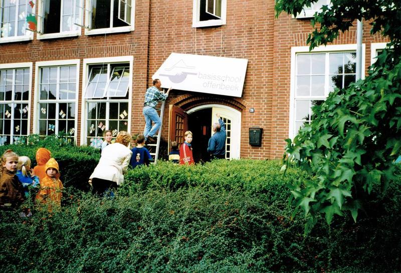 De groepen 5 t/m 8 verlaten de St. Jozefschool in Offenbeek die zal worden afgebroken om plaats te maken voor een nieuwe school. Op de foto wordt het naambord van de school gehaald. |