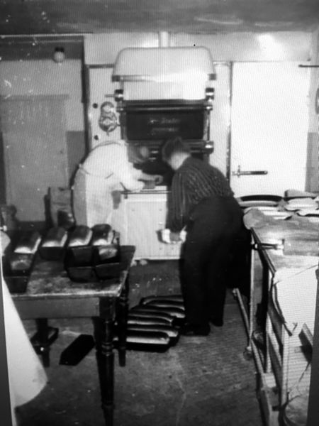 Winkels | Bakker Harrie Pubben bezig met melkbroden uit de oven te halen. | Pastoor Vranckenlaan 26 | Reuver | 1961 | ||||