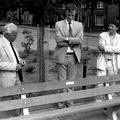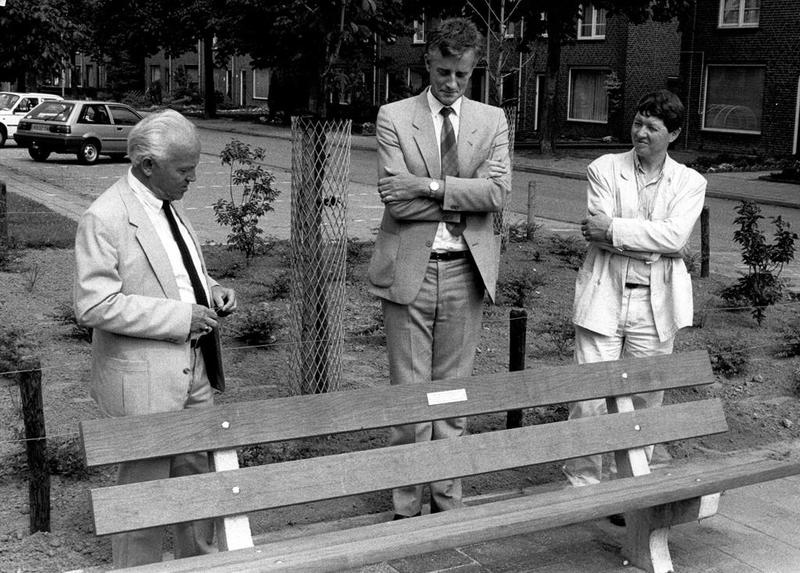 Diversen | Burgemeester Nuytens bekijkt de door het gemeentebestuur aan de Woningbouwvereniging geschonken bank. | Secretaris Moonenlaan | Reuver | 19-9-1986 | 1986 | |||