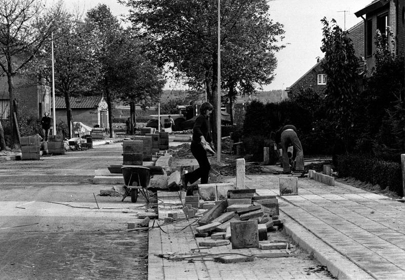 Wegen | De Industriestraat krijgt een nieuw wegdek en er worden nieuwe stoepen aangelegd. In het midden de garage van Pé Schoeren (op nr.137) en rechts de boerderij van Koch. | Industriestraat 84 | Offenbeek | 1976 | ||||