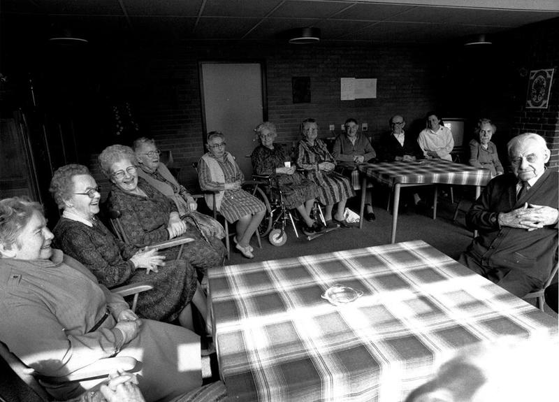Gebeurtenissen | De bejaarden van het bejaardenhuis St. Lucia uit Beesel waren niet blij toen ze te horen kregen dat ze moesten verhuizen naar de bejaardenwoningen aan de Broeklaan in Reuver; alhoewel er nog wel een lach vanaf kon voor de foto. | Mariaplein 6 | Beesel | 1989 | ||||
