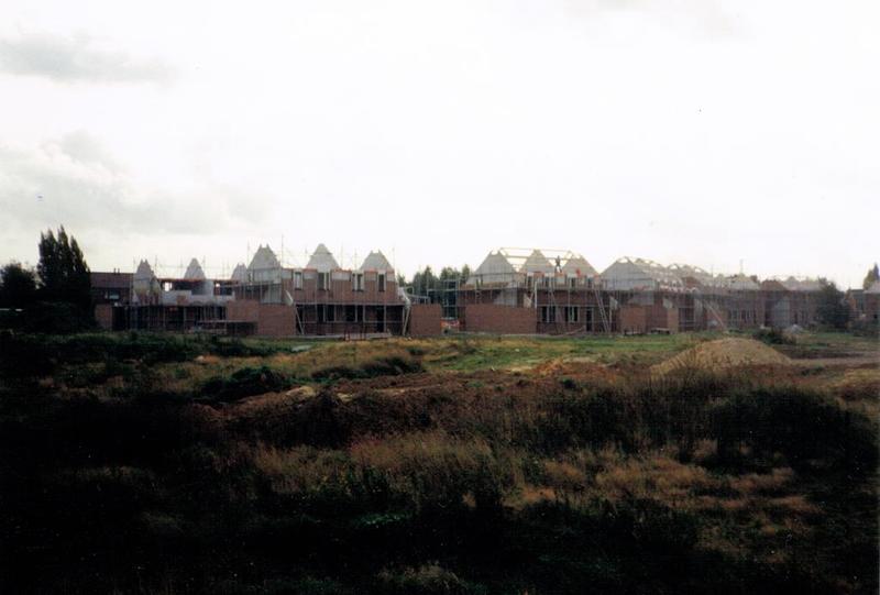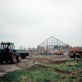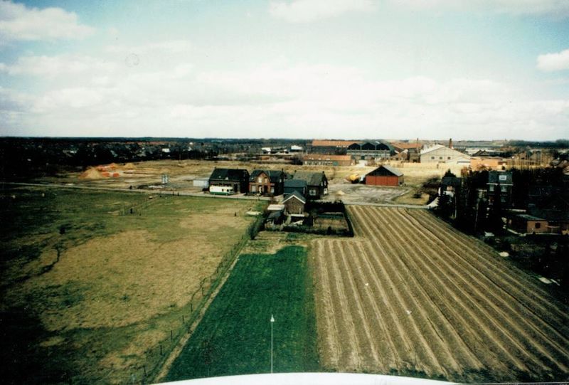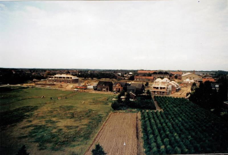 Foto genomen vanaf de silo van "de Steenbok"en laat het voormalig terrein van de fabriek van Janssen-Willemsen zien waar uiteindelijk het gemeenschapshuis "de Schakel" is gebouwd. Op de achtergrond is men bezig met grondwerk voor de bejaardenflat "Biej de Breer" |