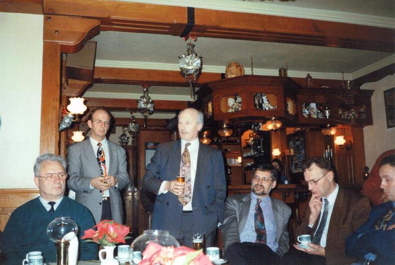 Nadat de eerste steen was gelegd door ere-voorzitter Pierre van Lier bleef het gezelschap nog gezellig bijeen in café Lambaerke. Aannemer Habets spreekt het gezelschap toe. Links naast Habets directeur Dré Theeuwen van de Woningstichting. |