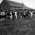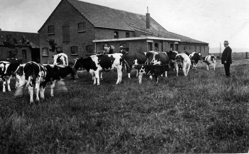 Het vee rondom de boerderij Grossholz wordt goedkeurend in ogenschouw genomen door vader Grossholz. De familie Goertz kreeg de boerderij als compensatie voor het opblazen door de Duitsers van hun boerderij aan het veer. De familie Grossholz waren Rijksduitsers en hun bezittingen werden in 1945 geconfisqueerd. |