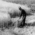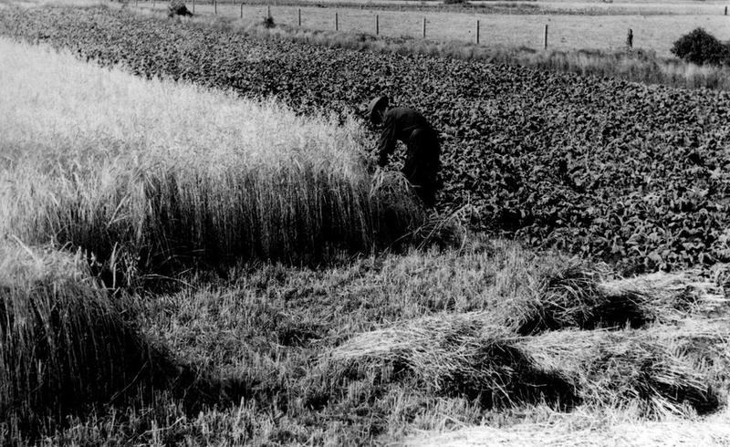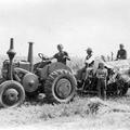 Met een Landz Buldog tractor wordt de oogst gemaaid rondom boerderij Grossholz. Kurt, vader Grossholz, Benno en Franz helpen allen een handje mee. De familie Goertz kreeg de boerderij als compensatie voor het opblazen door de Duitsers van hun boerderij aan het veer. De familie Grossholz waren Rijksduitsers en hun bezittingen werden in 1945 geconfisqueerd. |