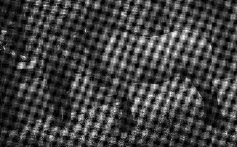 Trots poseert Fried Schoeren met zijn paard voor zijn woning in Offenbeek. De zonen Wiel en Coen kijken goedkeurend toe. |