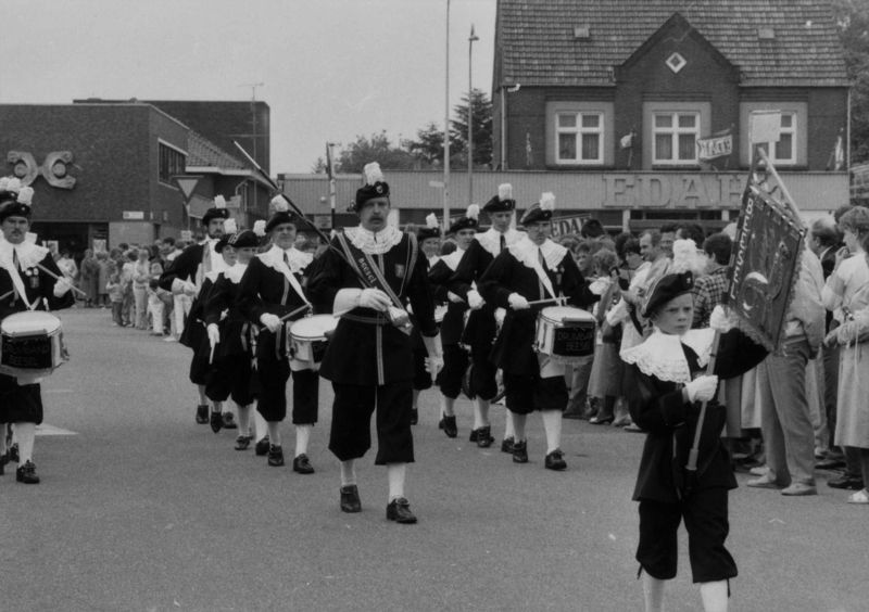 Verenigingen en organisaties | In de optocht t.g.v. het 40-jarig bestaan trok ook dit “oude”fluiterkorps mee o.l.v. de eerste tambour-maitre Bèr Dorssers, die duidelijk wat meer moeite heeft met het tempo als in zijn jongere dagen. | Raadhuisplein | Reuver | 1986 | ||||