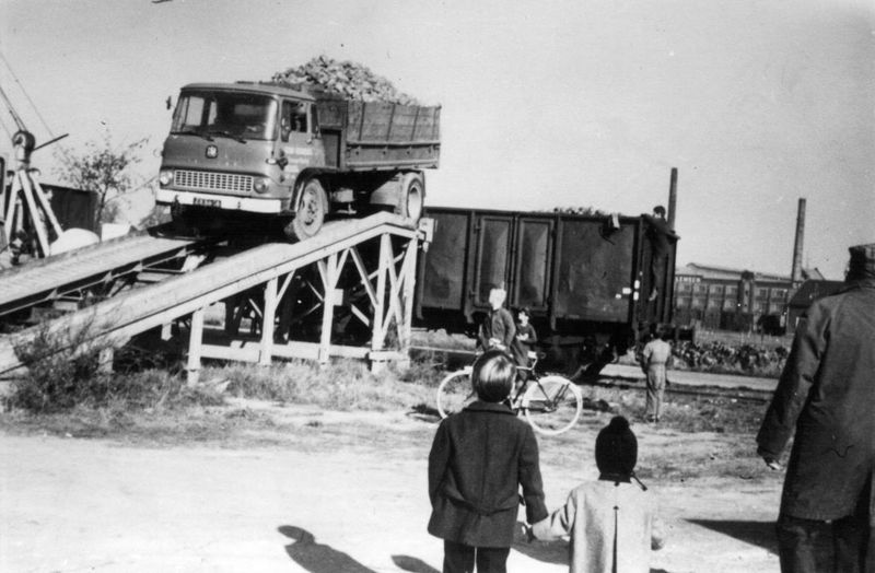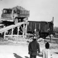 Het laden van de bieten bij de Boerenbond op het spoor dat van het station naar de fabriek van Laumans leidde. Op de achtergrond de fabriek van Janssen-Willemsen. Op de voorgrond Piet Vogels jr. |