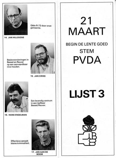 Folder van de PVDA - Beesel-Reuver met portret foto's onder andere: Jan Hillekens, Jan Crins, Hans Engelmann en Jan aan de Boom. |