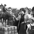 Na het gereedkomen van het verfraaide kerkplein in Reuver-Offenbeek, kreeg het kunstwerk "De Kleisjtaeker" een nieuwe plek op de hoek Keulseweg - Pater Claretstraat. Het beeld werd in eerste instantie per ongeluk verkeerd om geplaatst met de kop richting Offenbeek (de Duitse grens) en is later omgekeerd zodat het nu (als op de foto te zien is) richting Reuver wijst. Bij het beeld links pastoor Verdonschot van Offenbeek. Verder burgemeester J. Hendrix en echtgenote. |