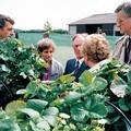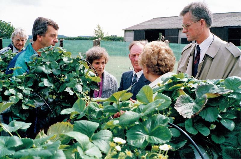 Het Russisch echtpaar Maria en Nikolay Kolosok uit Windje, een plaats in de buurt van Moskou waren op bezoek in Reuver en werden onder anderen begeleid door burgemeester Nuytens. Op de foto bekijken ze de aardbeienteelt van Frits Boonen. |
