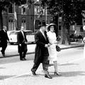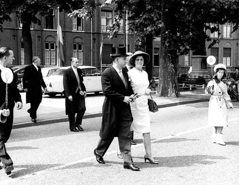 De installatie van burgemeester J.T. Hendrix. Burgemeester Hendrix loopt hier samen met zijn vrouw over de Rijksweg, gevolgd door Piet Vincent, Coen Vaessen en Rein Höver. |