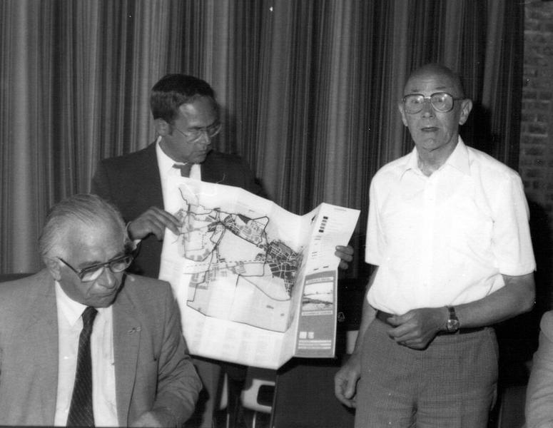 Gebeurtenissen | De uitgave van de nieuwe VVV-Routekaart in 1983. De kaart wordt aandachtig bekeken door v.l.n.r. burgemeester Hendrix, Toon Geerlings (voorzitter VVV-Reuver) en Crins (bestuurslid Rabobank-Reuver). | Raadhuisplein 1 | Reuver | Juni 1983 | ||||