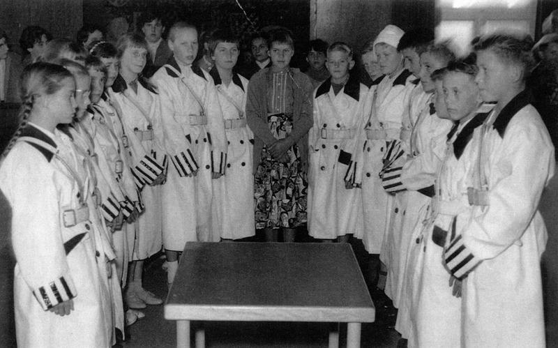 Een foto van de installatie van de tweede groep verkeersbrigadiers in het oud gemeentehuis te Reuver. Deze verkeersbrigadiers voor het schooljaar 1958 - 1959 werden opgeleid door wachtmeester van Helden. Op de foto staan onder andere van links naar rechts: Lenie Ramakers, Doriet Verbakel, Jes Timmermans, Riki Killaars, Gerry Ligthart, Tini Cruysberg, José Pollen, André van Bavel, Harrie Fleuren, Geert Thijssen, Wiel Aelen en Jack Dings. |