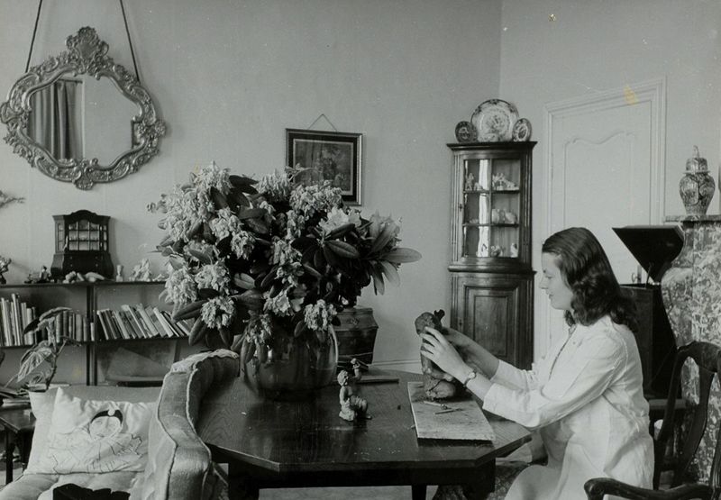 Kasteel Hillenraad. De dochter des huizes, gravin Eugenie Maria Mechtilda Huberta Theodora Thaddeus Wolff Metternich, aan het modelleren met klei. |