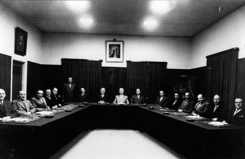De gemeenteraad in de periode 1953 - 1958. van links naar rechts : Lei Geujen, Frits Cremers, Harrie Geraedts, Sjeng Smolenaars, Kuub Simons, Piet Timmermans (notulist), Klaas de Vlieger (wethouder), Sjeng Steeghs (wethouder), Burgemeester Claessen, A. Kessels (secretaris), Leike van der Velden, Jac Laumans, Piet Vincent, Piet Lommen, Sjeng peeters en Lei Peeters. De foto is genomen in de vergaderzaal van het oude gemeentehuis. |