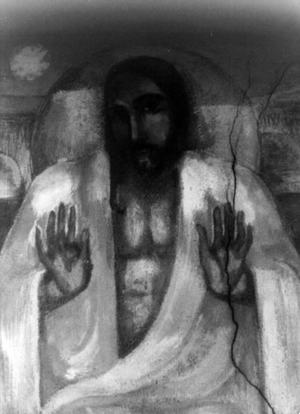 Kunstwerk in de crypte van de Dionysiuskerk in Asselt. Het rozenkerkje wordt dit kerkje ook wel genoemd. |