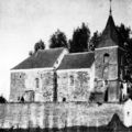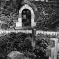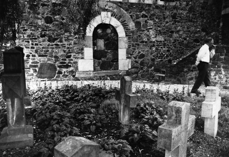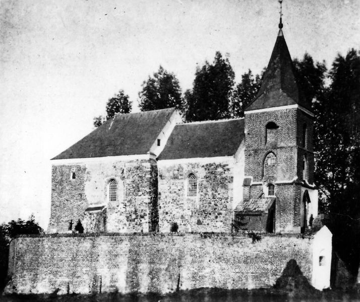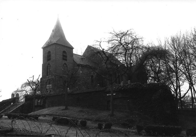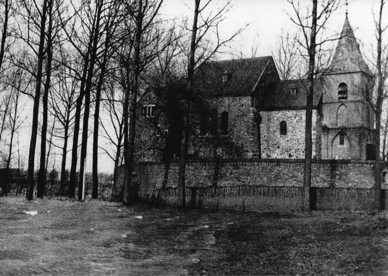 Dionysiuskerk in Asselt. Het rozenkerkje wordt dit kerkje ook wel genoemd. Op de foto is het dichtgemetselde Noormannen poortje te zien met pastoor Willems. |