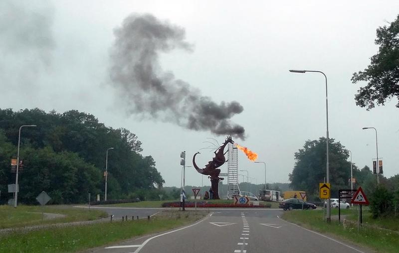 Draaksteken | Op zondag 24 juli 2016 werd de vuurspuwende draak getest voor de komende uitvoering van het Draaksteken in Beesel wat gehouden wordt van 12 tot en met 21 augustus 2016. De draak is ontworpen en gemaakt door Rik van Rijswick een kunstenaar uit Beesel. De draak staat op de rotonde tussen Reuver - Beesel en Swalmen. | Rijksweg 1a | Reuver | 24-7-2016 | 2016 | |||