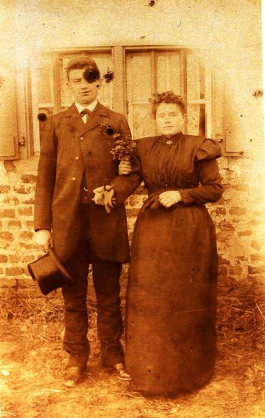 Huwelijksfoto van Thei Schoeren en Trienke. 1899. Ze zijn de ouders van An Janssen-Schoeren, moeder van schoenmaker Thei Janssen. Hij woonde op de Hei. In de buurt van de Beukelstraat. Orginele foto in bezit van Jan Ickenroth |