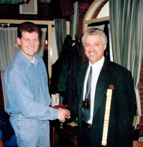 Gebeurtenissen | Vöör het nieuwe wielerseizoen werd de Reuverse wielerkenner van het jaar 1993, Theo van Helden (rechts) gehuldigd door de prins van het jaar 1993, Hans 1 (Boonen) zelf ook wielerfanaat. Theo van Helden won in Reuver de wielertoto, bestaande uit 25 grote wielerwedstrijden. | Keulseweg 101 | Offenbeek | 17-5-1994 | 1994 | |||