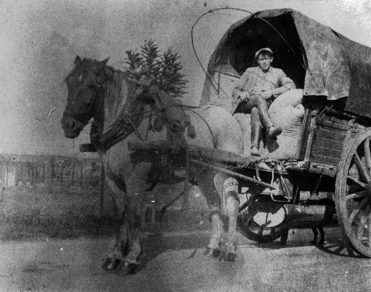 Piet v.d. Beuken met paard en wagen ergens in Belfeld onderweg. Piet woonde in de Heerstraat in Reuver. |