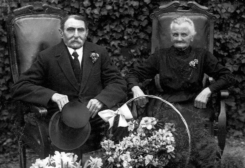 Gebeurtenissen | Een foto van het echtpaar W. Augustus en Mieke Augustus-Vossen bij hun gouden bruiloft in 1920. Het gouden paar zit op stoelen die geschonken zijn door de buurt De Klok. | Reuver | 1920 | |||||