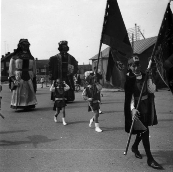 Carnaval | Het reuzenpaar Ties en Lies. De vaandeldrager op deze foto is Wiel Schoolmeesters. | Keulseweg 33 | Reuver | 1967 | ||||