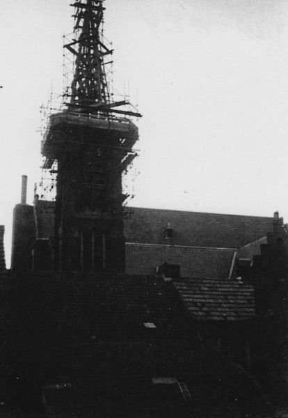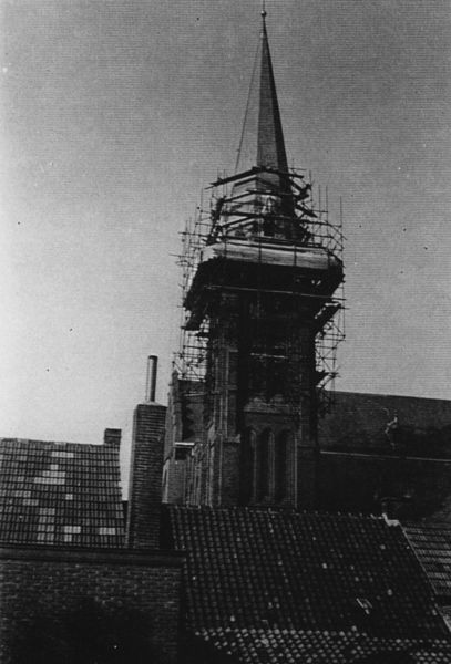 Kerk en religie | De bouw van de nieuwe torenspits van de St.Lambertuskerk in 1956 - 1957. | Karel Doormanlaan 2 | Reuver | 1956 | ||||