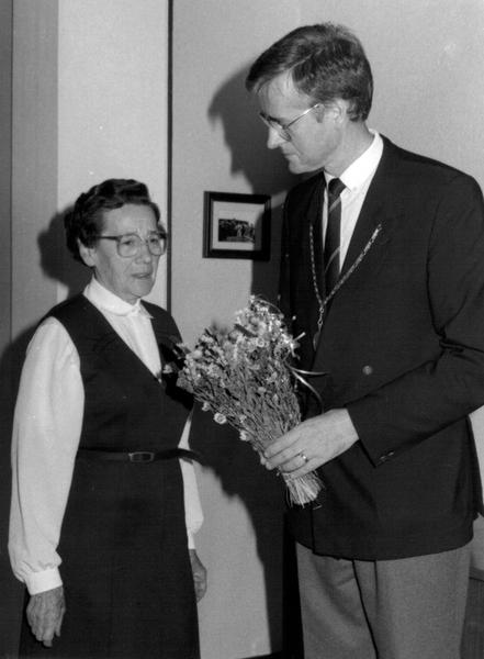 Verenigingen en organisaties | Buurt "Noord" verkoopt elk jaar droogbloemen waarbij de opbrengst ten goede komt aan een feestmiddag voor de bejaarden. Burgemeester Nuytens neemt de eerste droogbloemen in ontvangst van mevr. Cuypers. | Raadhuisplein 1 | Reuver | 22-10-1987 | 1987 | |||
