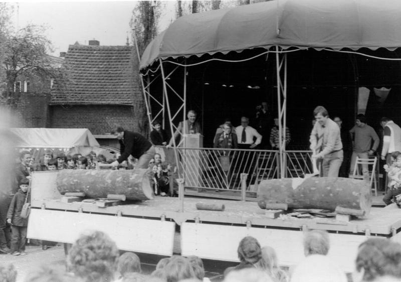 Gebeurtenissen | Tijdens de Koninginnefeesten werd er een houthakwedstrijd gehouden. We zien onder andere Harrie Cox, Thei Steeghs (Neutje) en pastoor Leën. | Raadhuisplein | Reuver | 1982 | ||||