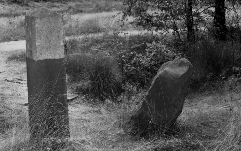 Diversen | Een foto van de “Witte Steen”aan de grens zoals die er lag aan het begin van de vorige eeuw. Volgens Loe Giesen is er op deze plaats geen sprake van een steen wel van een “Witten Paell”of “Weissen Pfahl” in oude teksten of op oude kaarten vanaf de 17e eeuw. Het is natuurlijk mogelijk dat ook hier een steen lag, want ook de steen bij grenspaal 430 wordt genoemd de “Grijsen Pael”. Beide stenen liggen merkwaardig genoeg in dezelfde houding. Bij de “Witte Steen” staat ook nog een grenspaal uit 1848 Meer ... | Prinsendijk | Offenbeek | 1983 | ||||