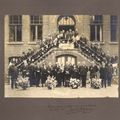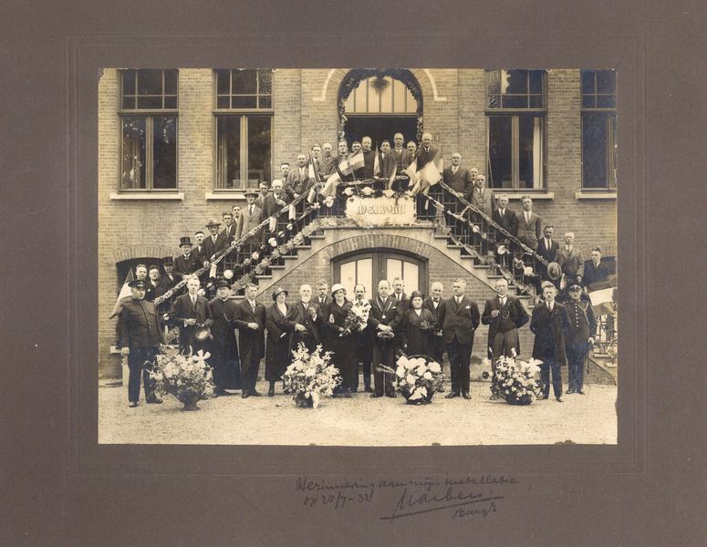 Foto van de installatie van burgemeester Harbers in Belfeld. Te zien zijn burgemeester Rudolf Harbers, zijn vrouw en zijn ouders. Verder is de pastoor ook herkenbaar en er zullen gemeenteraadsleden en andere notabelen op de foto staan. Op het spandoek staat vermeld Welkom. Het is de originele foto, want er is met de hand een onderschrift op geschreven : ter herinnering aan mijn installatie op 28/7-32 en ondertekend door Harbers, Burg. Harbers was burgemeester tot 1942 toen hij door de Duitse Meer ... |