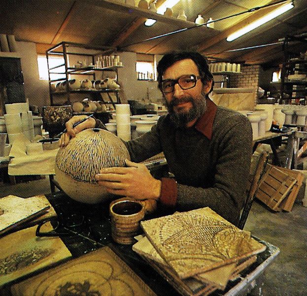 Fabrieken / Bedrijven | De Argentijn Rodolfo Gonzalez-Mele, voormalig medewerker van Loré, ging vanaf 1970 een grote rol spelen in de technische ontwikkeling van nieuwe bouwkeramiek. Hij ontwierp de tegels en stelde de glazuren samen. Daarnaast was hij een bekwaam keramist, die, zoals op de foto te zien is, zich bezighield met artistieke keramiek, die bij de Steenbok toch nog een rol bleef spelen. | Doctor Poelsstraat 1 | Offenbeek | 1975 | ||||