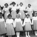 Klassenfoto van een klas uit de H. Hartschool bij de gelegenheid van de geboorte van prinses Beatrix en de dat jaar gehouden kindsheid optocht. Van links naar rechts: eerste rij: 1 Stien Berden, 2 Jet Denessen, 3 Joke Snellen, 4 Alda Thijssen, 5 Bep Keiren tweede rij: 1 Zuster Urselein, 2 Jeanne Julicher, 3 Riet Wolfs, 4 Lena Heinen, 5 Lies Smolenaars. |