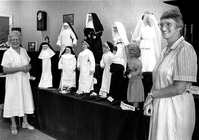 Kerk en religie | Zuster Damiana (links) legt de laatste hand aan de tentoonstelling klederdrachten van de dominicanessen. Priorin zuster Catherina kijkt toe | Pastoor vranckenlaan 4 | Reuver | 6-9-1991 | 1991 | |||